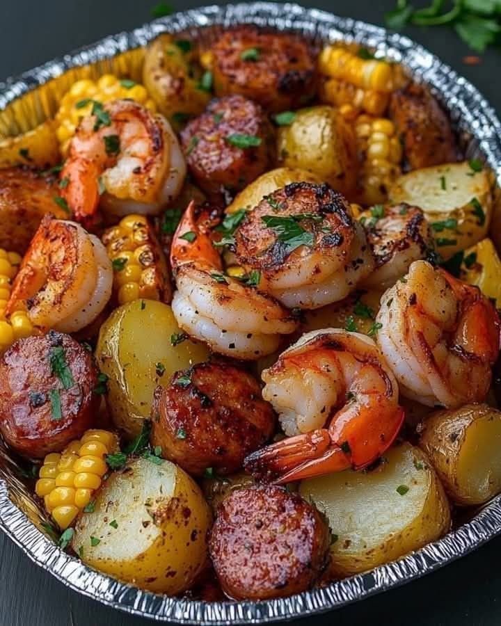 A no-mess, all-flavor dinner — juicy shrimp, smoky sausage, tender potatoes, and sweet corn, all cooked together in foil. Perfect for oven, grill, or campfire ✅ Ingredients (Serves 4) 👩🍳 Step-by-Step Instructions